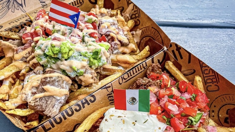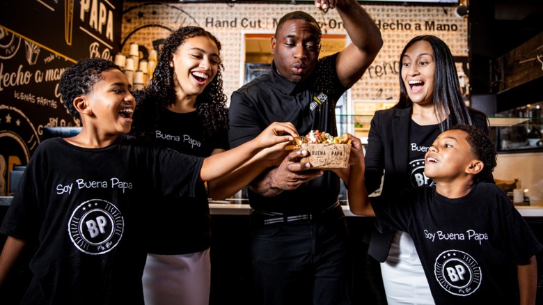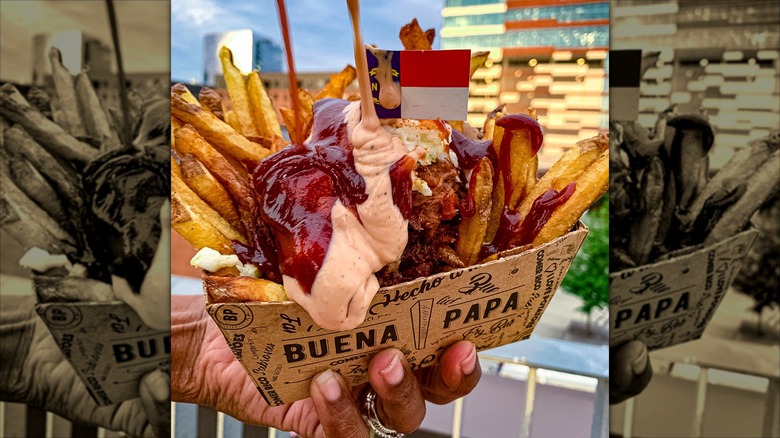 Founded by Johanna and James Windon in 2021, Buena Papa — Spanish for "good potato" — takes loaded fries to a whole new level. Having seen a disruption in their cleaning business during the pandemic, the couple was searching for a new outlet for their entrepreneurial energies. Johanna, who was born in Bogota, Colombia, and immigrated to the U.S. at age six, decided to tap into her roots. More specifically, she honed in on a popular Colombian meal called Bandeja Paisa, which can include beans, rice, chorizo, and crispy pork belly. Without rice at the ready, the couple decided to see how the various elements would work over fries. It was an instant hit — at least with the Windons, who further refined the idea in their home kitchen.