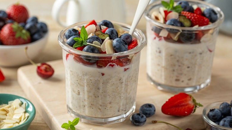 Most of the fun of making overnight oats comes down to all the ingredients you add in. There are basically limitless options — just mix in whatever sounds best to you. Many overnight oats enthusiasts want to add fruit to their oats, which can add natural sweetness and a ton of flavor. For some fruits, that's not a problem. Apples and bananas, for example, generally do well in the fridge overnight, even when sitting in soggy oats. There are some other fruits, though, like berries, that should be added right before you eat your oats... not before.