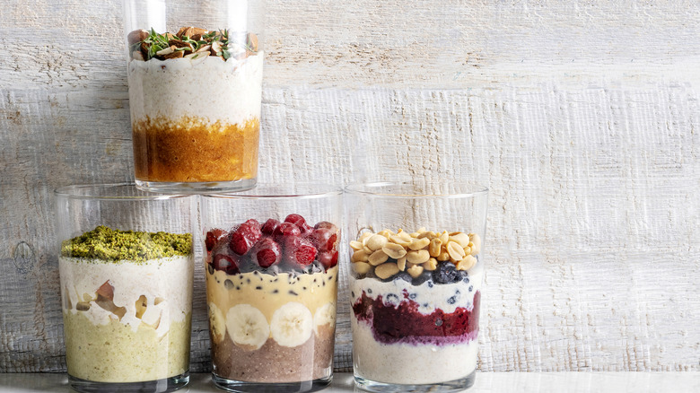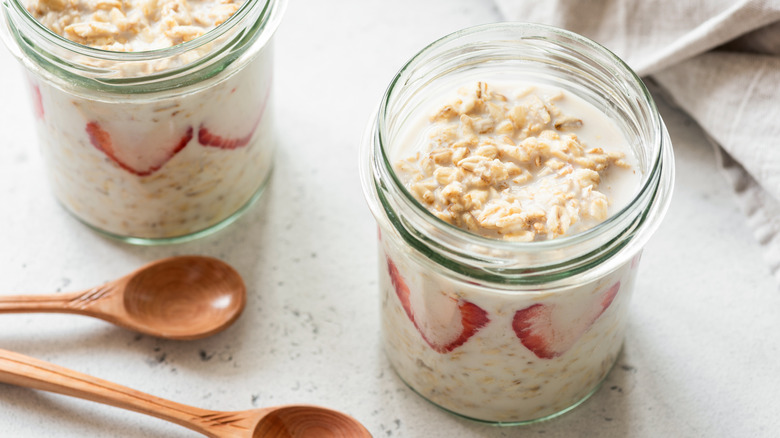 So, why shouldn't you use these other varieties? It all comes down to texture and consistency. We love instant oats because they're so easy to make even when you're pinched for time. But if you leave them sitting in liquid in the fridge for more than a couple of hours, they're going to get super soggy — probably not what you want for your first meal of the day. Steel cut oats have a different problem. They don't absorb moisture as fast as their counterparts, so you'll be left with hard, gritty oatmeal in the morning if you try to use them for overnight oats.