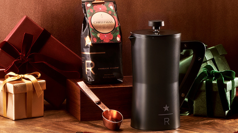 Kicking off this Christmas-forward collection is The Holiday Moment Gift Set, a duet of the Starbucks Reserve Christmas 2023 coffee blend and a gold-and-floral commemorative coffee mug ($46.95). If you're looking for something that takes the coffee theme a step further, turn to the Fa La La Brew Gift Set ($89.90). This collection (pictured) features the Starbucks Reserve Christmas 2023 coffee blend along with a custom coffee press and a copper scoop.