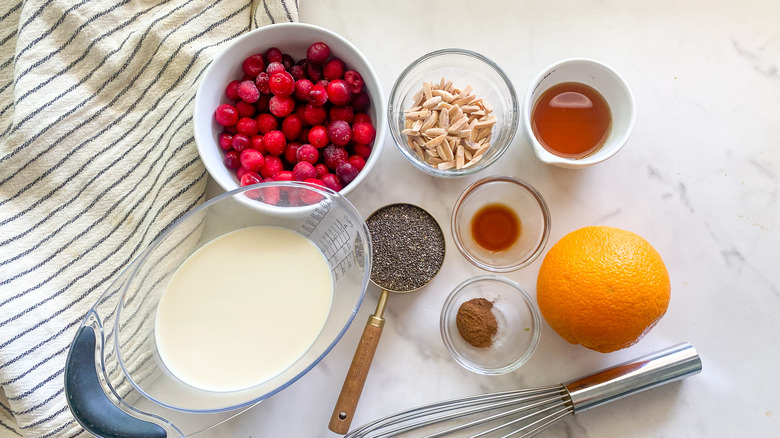 To make this recipe, there's a short list of ingredients. You'll of course need some cranberries, and fresh or frozen will work. If you're in the produce aisle also grab an orange, then move on to the dry goods section and get some chia seeds, maple syrup, cinnamon, vanilla, and slivered almonds. Then head to the refrigerated section and pick up soy milk and whipped cream, if you want to get fancy when topping.