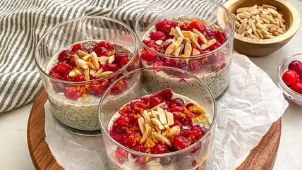 Wellness coach and recipe developer Miriam Hahn brings us this recipe for cranberry almond chia pudding and says, "Why not ring in the holiday season with cranberries when they are bountiful? They're loaded with health benefits and offer a tart, slightly sweet flavor to complement the neutral chia seeds. Plus, the ruby red color is a gorgeous way to brighten up your chia pudding."