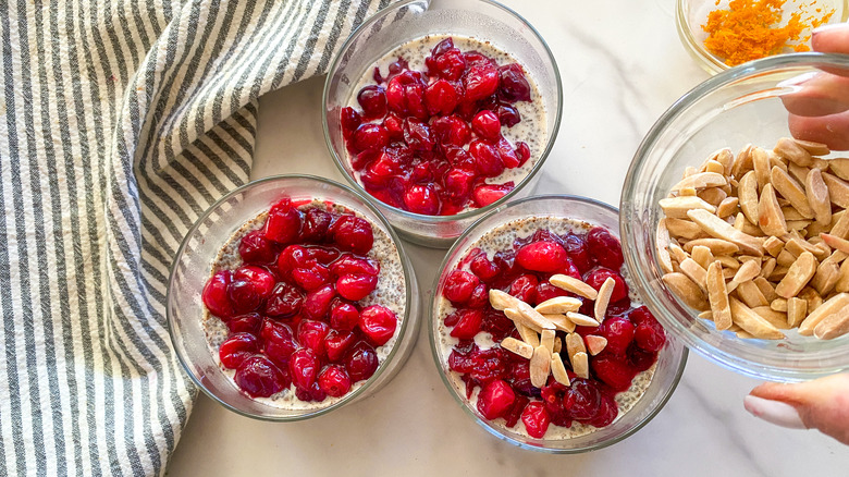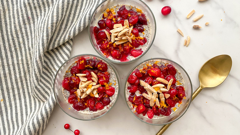- Top the chia pudding with the cranberry mixture, slivered almonds, and orange zest before serving.