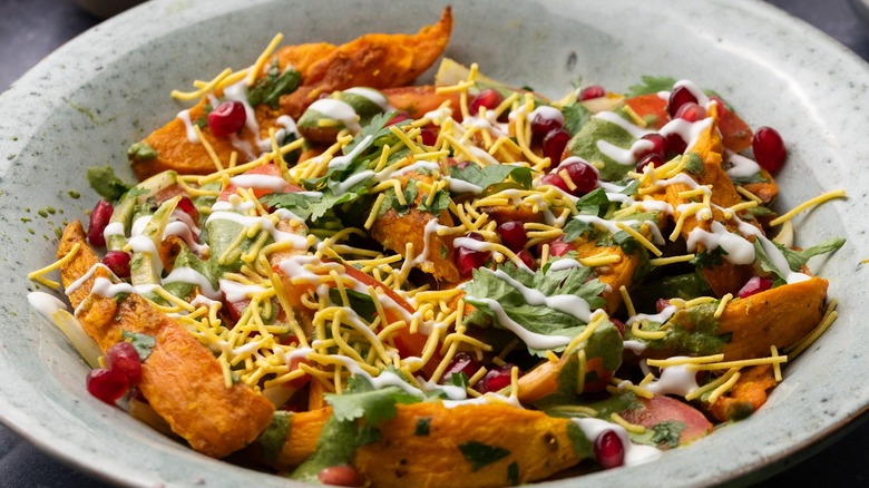 The beauty of chaat is that you can get as creative as you'd like with additional ingredients. Sweet potatoes and chaat masala are the jumping-off point to a world of variations. The sauces and chutneys you drizzle over the spiced potatoes are the perfect places to start flexing your creativity. You can continue the theme of sweet and tangy by creating a sour yogurt sauce with chopped herbs like cilantro and mint and a spoonful of rich, sweet pomegranate molasses. Or, you could use the sweet and tangy foundation to balance opposing flavors by using a spicy, umami sauce full of fresh chilies, stewed tomatoes, garlic, and grated ginger.