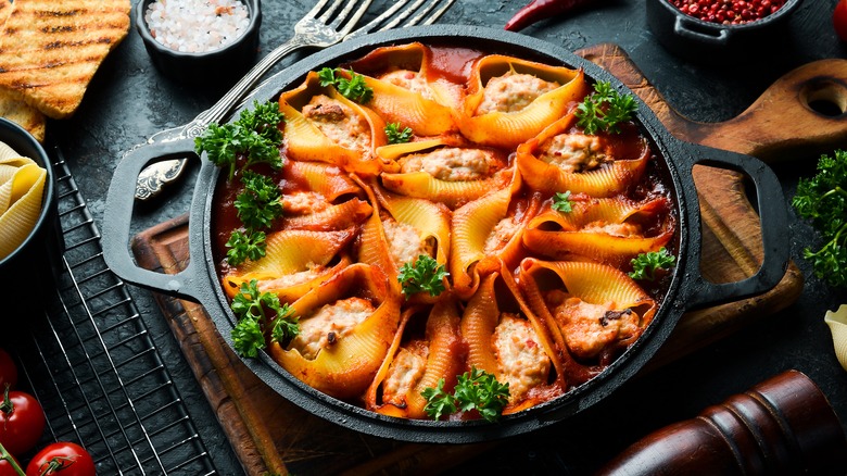 After boiling and stuffing your jumbo conchiglioni, space them out on a lined baking sheet before freezing to prevent them from clumping together or adhering to the base of the tray. You can either freeze them overnight until they are solid in the center or just wait for about half an hour for the shells to develop a slightly hard exterior. At either of these points, you can transfer the shells to a lidded container or into freezer bags, making sure to boost their freezer lifespan by removing any excess air. Alternatively, you can put the shells in the dish you'd like to eventually bake them in, cover the top in plastic wrap, and freeze the whole thing so you can conveniently cook the dish later with the quick addition of sauce.