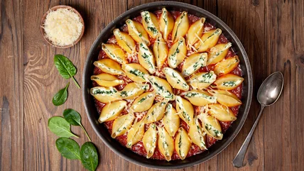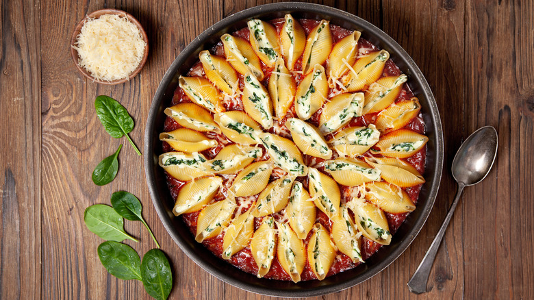 This technique prevents the shells from sticking together and guarantees they won't become floppy and unpalatable once reheated. The pasta remains al dente because it hasn't had the opportunity to absorb any sauce as it chills. Freezing the shells without the sauce also leaves you with oodles of creative leeway when dinnertime arrives instead of locking you into a set flavor. You can pair the shells with a simple marinara one day, an alfredo the next, and a fragrant pesto later in the month. As long as the shells are prepped with their filling, you can create a new dish at your leisure simply by switching up the sauce, adding some veggies, and scattering some toppings, such as shredded Parmesan, panko breadcrumbs, or fresh herbs.