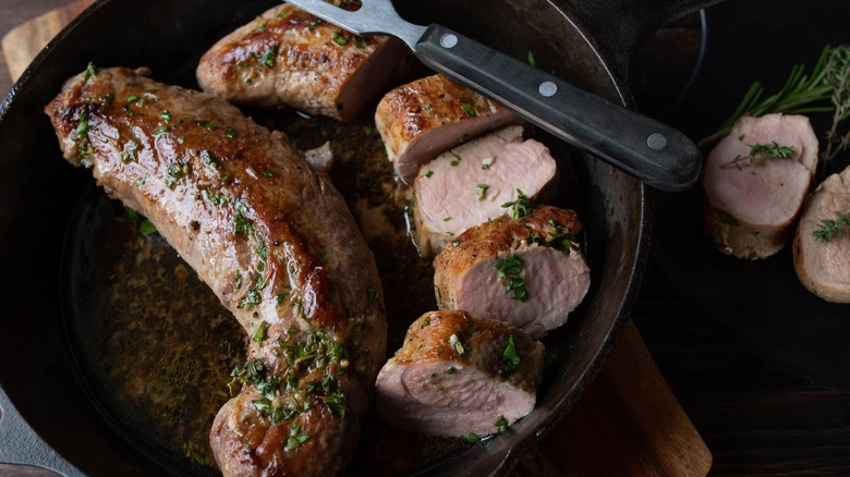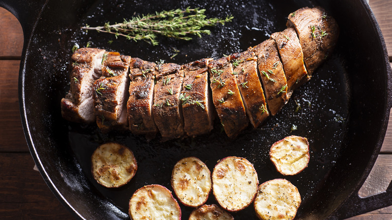 If you'd like to step your pork tenderloin game up a notch, there is a method that goes a bit beyond simply heating the pan on the stovetop. To harness the full potential of your skillet, preheat it in the oven while the oven itself comes up to roasting temperature. This step allows the skillet to be thoroughly hot when it's time to sear the pork. When the oven reaches the desired temperature, carefully remove the skillet and place it on a full-blast burner. Add a bit of oil and the pork tenderloin to the hot skillet, and let it sear on one side before flipping it over and placing the whole affair in the oven to finish roasting.