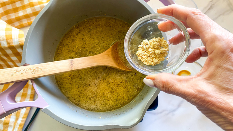 - Add 2 cups water, bouillon cube, soy sauce, nutritional yeast, onion granules, dried mustard, and poultry seasoning. Stir for 3 minutes or until the bouillon cube has dissolved.