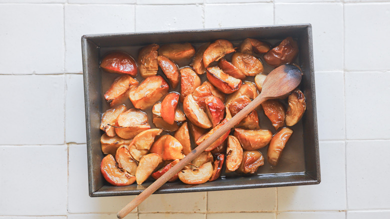 - Place the roasting pan in the preheated oven and roast the apples for about 30 minutes, or until they are soft and slightly caramelized.