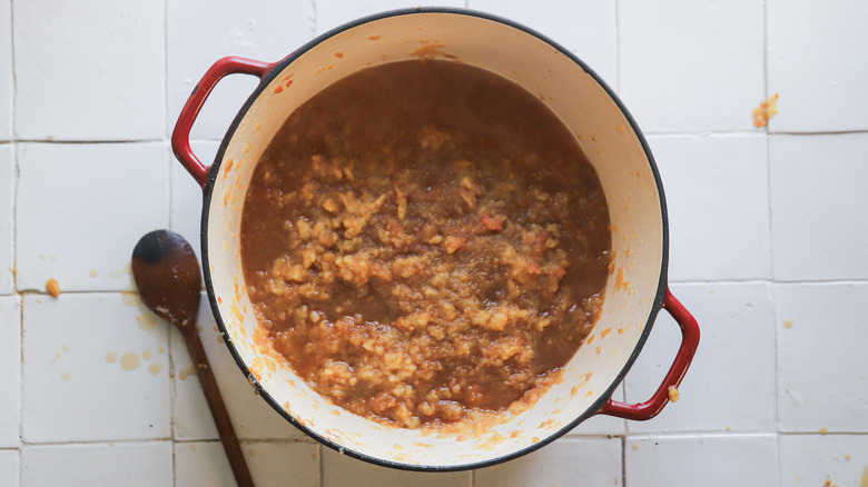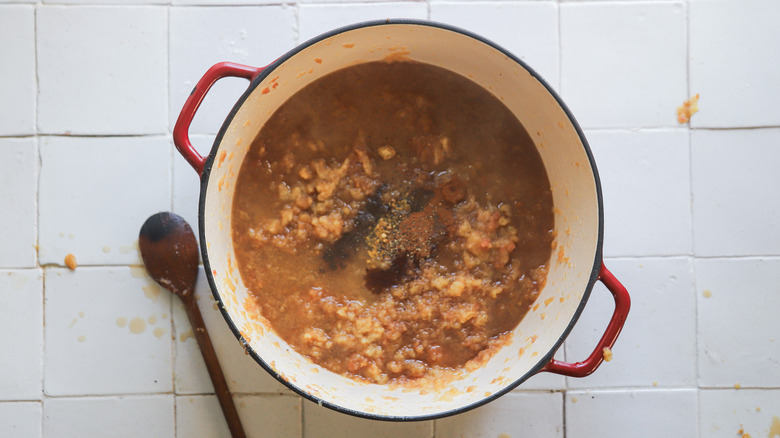 - Add remaining apple cider, apple cider vinegar, and the spices to the pot. Stir well to combine.