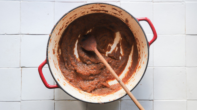 Remove the pan from the oven. Transfer the roasted apples and all the liquid from the roasting pan into a heavy-bottomed pot. If you have a food mill or ricer, press the apples through it into the pot to achieve a smoother consistency. If you don't, you can use a blender or a food processor to puree the apples, then transfer back to the pot.