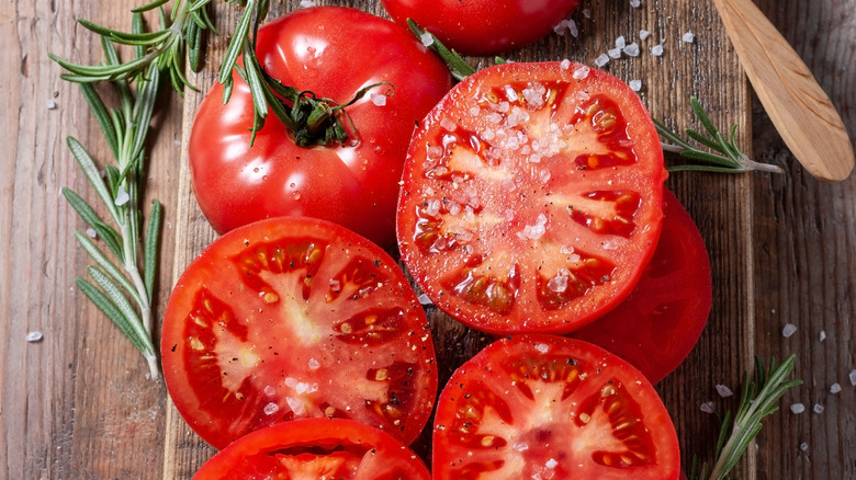 For the best results when preparing your tomatoes, follow these simple steps. First, slice your tomatoes, aiming for either thin or medium-thick slices. If you make slices that are too chunky, they will not only slide right out of your sandwich but will also have an improper tomato-to-seasoning ratio, hampering the taste. Place the tomato slices on a paper towel to absorb any excess moisture, then sprinkle the tomatoes with salt and any other seasonings you prefer. Leave the tomatoes to rest while assembling the beginnings of your sandwich so that the seasonings can work their magic, then add the tomatoes to the sandwich and dig in.