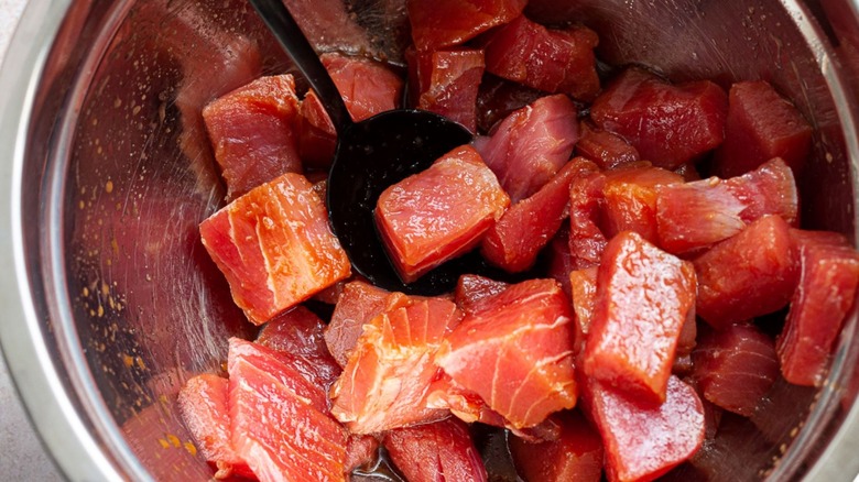 Working with fresh ahi tuna in a poke bowl can seem tricky. Determining whether your tuna is safe to eat raw can be confusing, as terms like "sushi-grade" are not regulated. But there are specific steps like low-temperature freezing that should be followed to ensure raw fish doesn't contain parasites. Once you've sourced your tuna you're left with another problem. How do you flavor your poke without messing up what makes it so fresh and delicious in the first place? Well, all you have to do is consider how poke is sold in its home state of Hawaii to get your answer. In grocery stores, it's dressed up in all kinds of sauces and marinades before being left to sit in chilled displays. The people of Hawaii know the most important step for tuna poke is marinating your fish, which will infuse it with plenty of flavor.