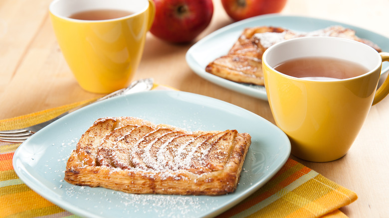 To make a delicious Danish at home, you'll need to enlist the help of apple butter. It's sweet, thick, and the perfect accompaniment for an autumnal pastry. After you've rolled and sliced your puff pastry into your desired Danish shape, spoon in the apple butter filling or enlist the help of a cream cheese filling too. After you've added the egg wash, place the pastry in the fridge to keep the fat cold before baking in a hot oven.