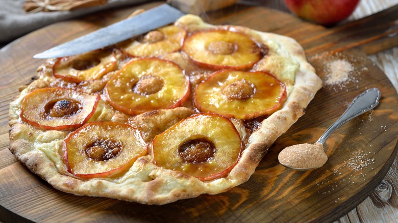 Coat your rolled dough with a thick layer of apple butter to make an apple butter dessert pizza. If you're only comfortable sticking with other sweet toppings, you should consider adding thinly sliced apples and chopped nuts to your pizza after it's finished baking. You can also play with the savory flavors and add toppings like fresh peppery arugula, gorgonzola cheese, and sharp cheddar. You might not be able to go back to your standard slice again.