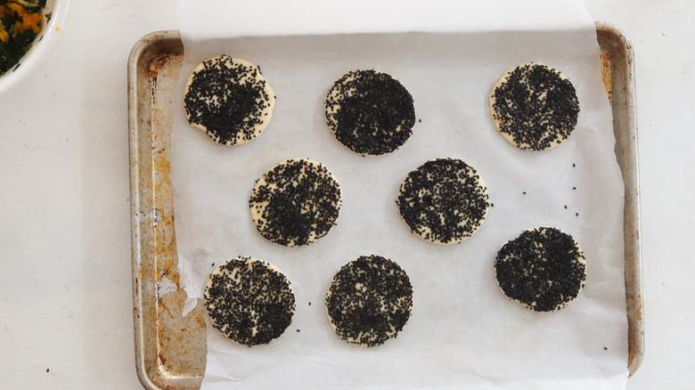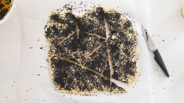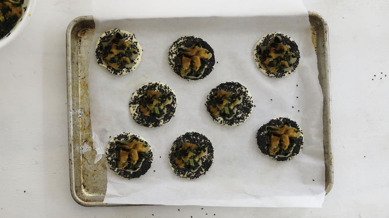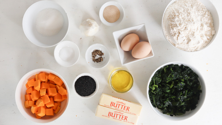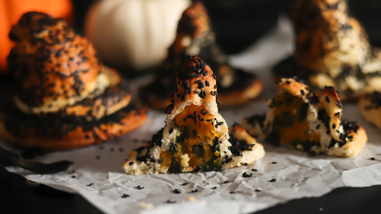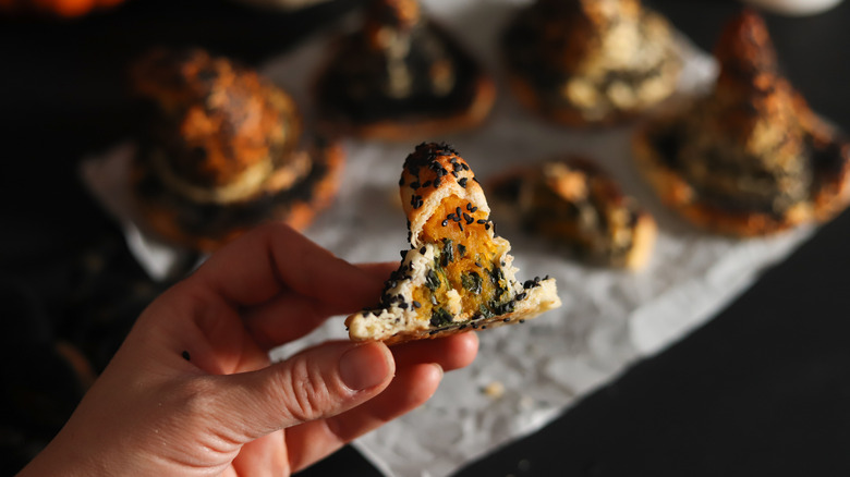 These witchy pastries are filled with roasted butternut squash and garlic — seasoned with olive oil, salt, and pepper — along with some frozen cooked spinach. To make the flaky dough, you'll need butter, an egg, sugar, flour, salt, active dry yeast, and warm water. Lastly, pick up some black sesame seeds for the finishing touch.