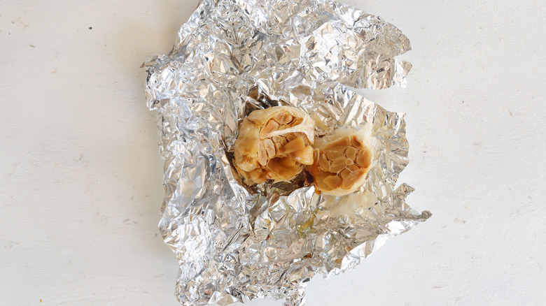 Cut garlic in half through the top and place on a sheet of foil. Drizzle with remaining 1 tablespoon olive oil and ½ teaspoon salt.