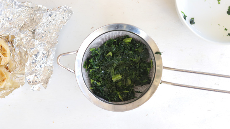 Combine the spinach with the butternut squash and roasted garlic, mashing everything together as you mix. Set aside.