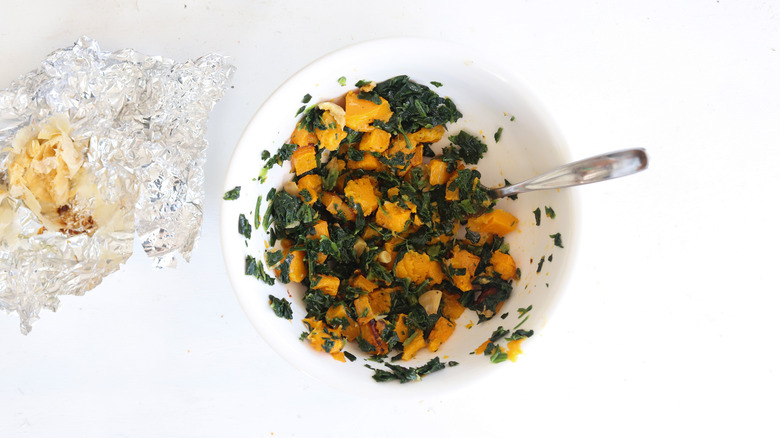 - Combine the spinach with the butternut squash and roasted garlic, mashing everything together as you mix. Set aside.
