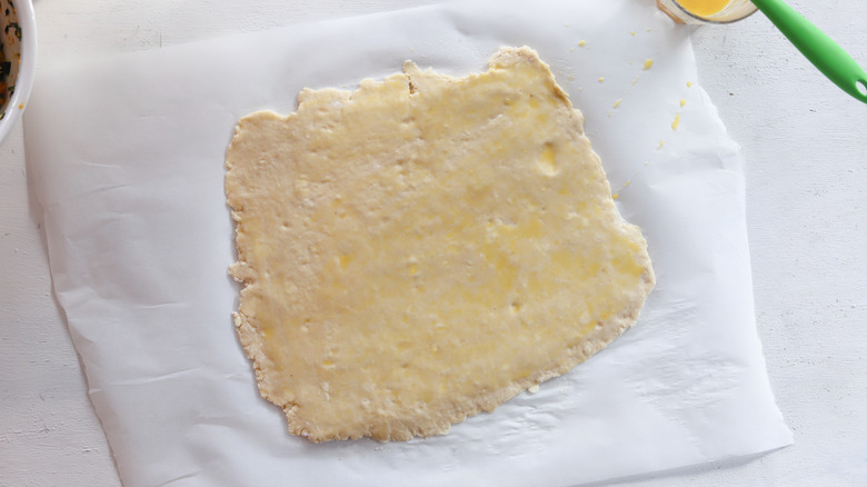 - Cut dough sheet in half and brush both pieces with egg wash.