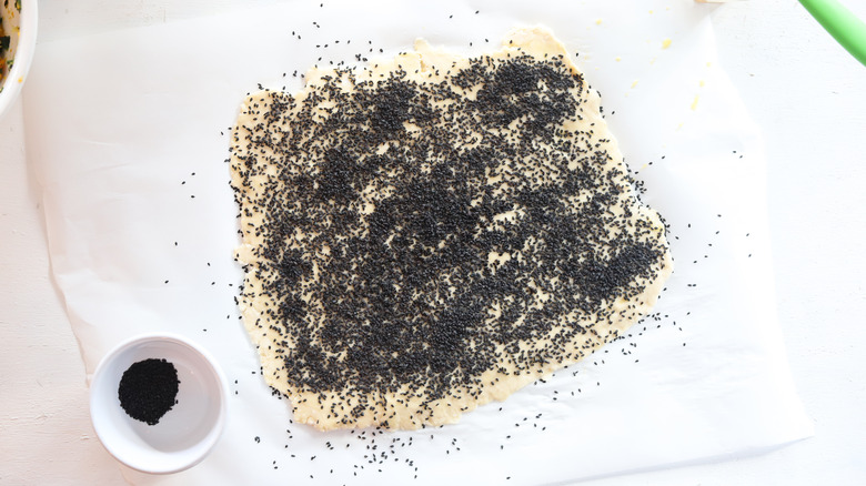 - Sprinkle both dough pieces generously with black sesame seeds until completely coated.