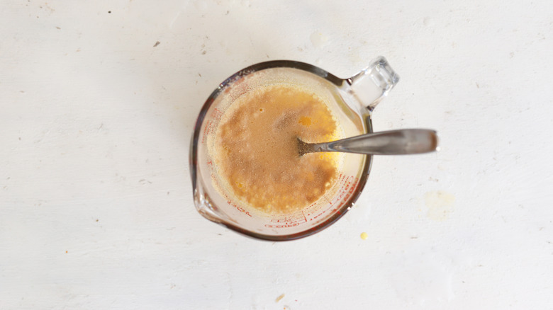 - Separately, add the yeast and 1 egg to ¾ cup lukewarm water. Whisk to combine.