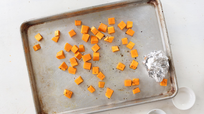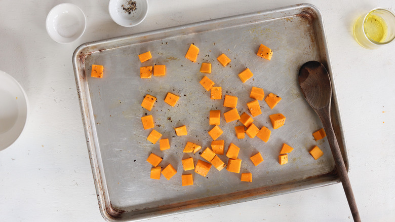 - Add cubed butternut squash to a baking sheet. Drizzle with 1 tablespoon olive oil and season with ½ teaspoon salt and black pepper. Toss to combine.