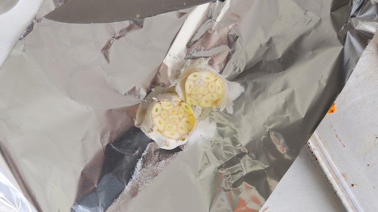 - Cut garlic in half through the top and place on a sheet of foil. Drizzle with remaining 1 tablespoon olive oil and ½ teaspoon salt.