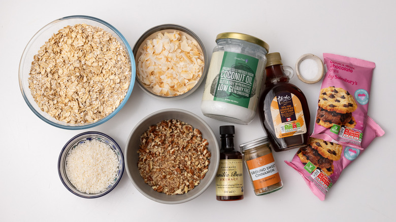To begin this gluten-free coconut and pecan granola recipe, you will first need gluten-free oats, pecans, desiccated coconut, coconut flakes, cinnamon, salt, coconut oil, maple syrup, vanilla extract, and chocolate chips.