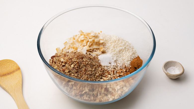 - In a large bowl, combine the gluten-free oats with the chopped pecans, desiccated coconut, coconut flakes, ground cinnamon, and sea salt.