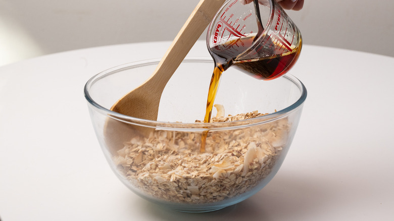 - Pour the liquids over the dry oat mixture and stir with a wooden spoon to thoroughly coat everything in the coconut oil and maple syrup.