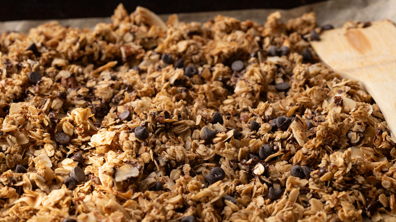 - Remove the granola from the oven and add the chocolate chips to the tray. Roughly mix everything together and allow the chocolate to partially melt.