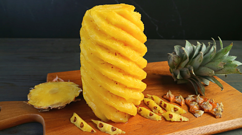 Pineapple is a luscious tropical delight that makes us want to spin around and sing like Maria in "The Sound of Music" as soon as we take a bite. But if we're really honest with ourselves, it can be a tough nut to crack, or in this case, a tough fruit to slice. Those spiky exteriors and fibrous cores are worthy adversaries for even the most skilled home cooks. But don't let yourself be intimidated. We're coming at you with a collection of pineapple-cutting hacks that will turn you into a pineapple master in no time.