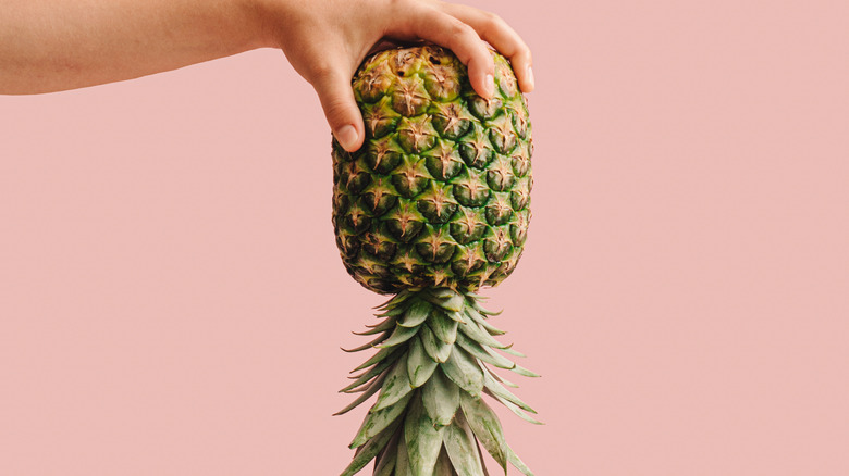 From removing the pineapple crown to navigating the treacherous spikes, there are a lot of things to contend with before you can access the fruit. Unfortunately, there's one more step to think about before slicing. Thankfully, it's an easy one. Simply flip the pineapple on its head as soon as you bring it home. This step ensures that the pineapple's juice gets distributed throughout the body, leading to equally sweet morsels.