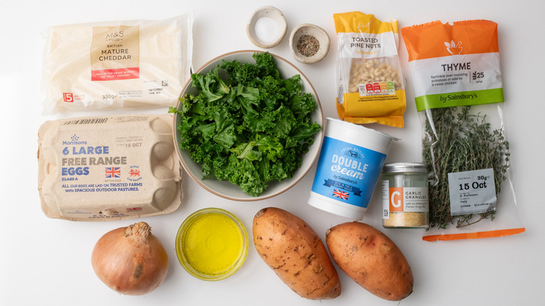 Gather the ingredients for this sweet potato and crispy kale frittata recipe