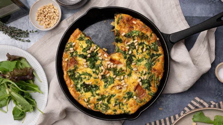 - Allow the cooked frittata to cool for 5 minutes, then top with toasted pine nuts to serve.