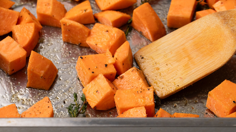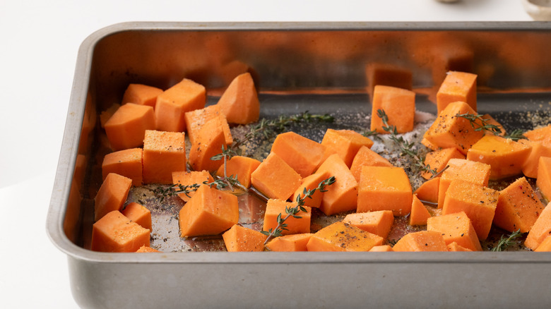- Preheat the oven to 375 F. Place the cubed sweet potato into a baking tray.