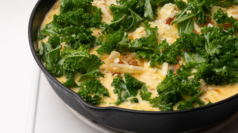 - Top the frittata mixture with the remaining cheddar cheese and the kale, pressing it lightly onto the top of the frittata.