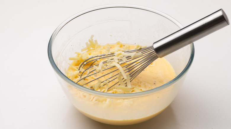 - In a large bowl, whisk the eggs with the cream, and season well with salt and pepper. Mix in ¾ of the sharp cheddar.
