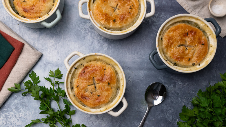 This recipe for vegetarian white bean pot pies, created by recipe developer Jennine Rye, is delicious whether you choose to follow a vegetarian diet or not. The delicate and flavorful white bean stew is packed full of veggies such as carrots and kale, with white wine, stock, and fresh herbs giving it a refined savory taste. The buttery, flaky puff pastry is the ideal topping for these pies, adding wonderful texture and a bit of crispy goodness. These pot pies make a light-yet-filling main option that can be served alone or with sides and make a great dinner choice that can be on the table in under an hour. Read on to find out how you can make these vegetarian white bean pot pies at home.