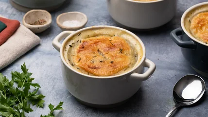 - Roll out the puff pastry and then cut out pastry lids to fit on the top of the casserole pots.