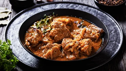 Carbonnade, also called Vlaamse stoverij is a Flemish food that's now one of Belgian's national dishes. The utilized cooking techniques combine German, French, and Dutch influences into a result that's distinctly Belgian. Its expanded name Carbonnade à la Flamande translates to Flemish stew, but its root etymology stems from the word for coal, a remnant of mining history. Before the dish was stewed, workers reheated affordable cuts of beef over coals. Later, the technique shifted to reheating the beef in liquid — oftentimes beer — creating a dish that's like a Belgian spin on boeuf bourguignon.