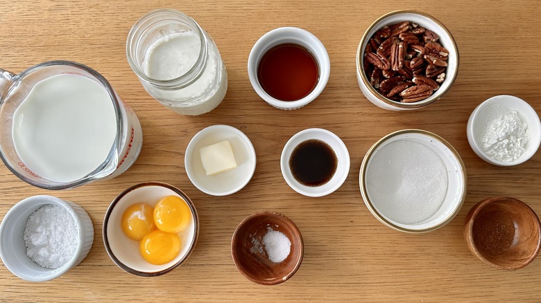 Gather the ingredients for vanilla chai spice pudding with maple pecans