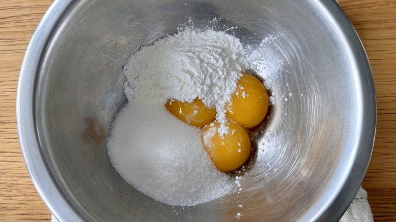 - In a small bowl combine egg yolks, remaining ¼ cup sugar, and cornstarch