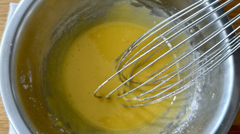 Slowly whisk hot milk mixture into egg yolks until at least half the liquid has been added.