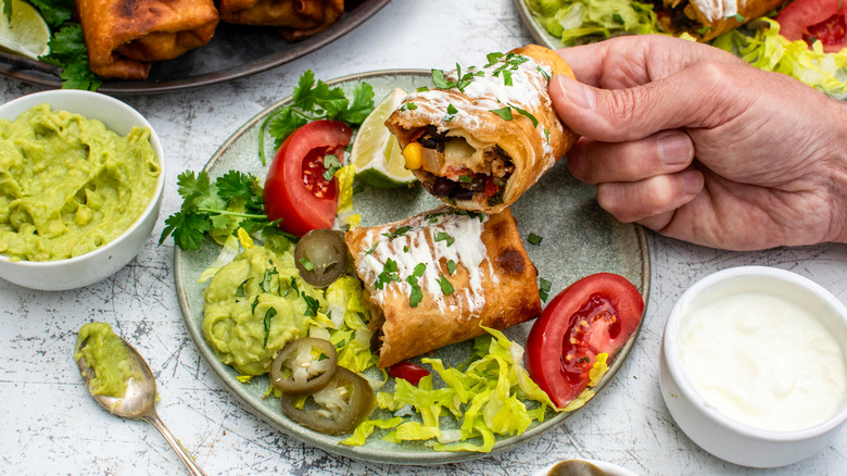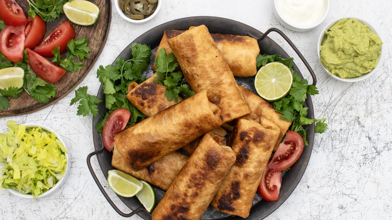 These chimichangas are best enjoyed immediately while they still are crispy and warm. If you have any leftovers, Randles advises reheating them in a conventional oven, toaster oven, air-fryer, pan, or skillet to preserve their crispiness. Avoid popping them in the microwave as they will turn soft.