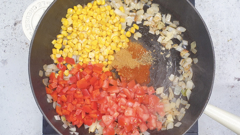 - Stir in the corn, bell pepper, tomatoes, ground cumin, smoked paprika, oregano, and cayenne pepper and saute until the vegetables are tender, about 4 to 5 minutes.