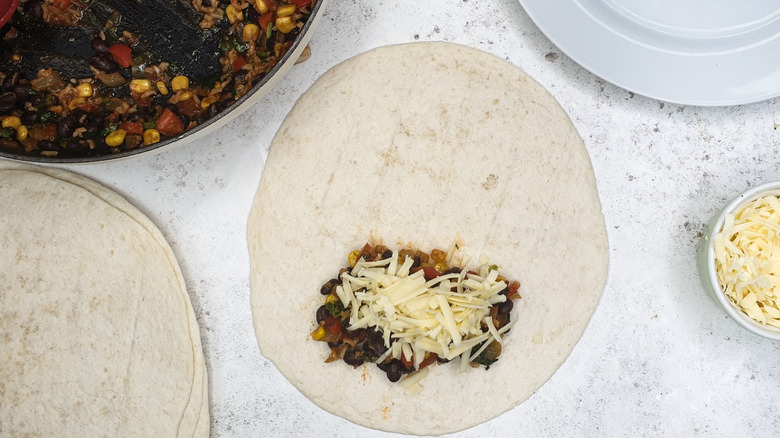- Lay out a tortilla on a clean surface. Add ½ cup of the bean mixture to the bottom half of the tortilla and top with 3 tablespoons of cheese.