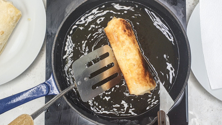 - Heat 1 inch of vegetable oil over medium-high heat in a frying pan or skillet. When the oil starts sizzling, carefully place 1 chimichanga seam-side down in the pan. Fry the chimichanga until golden brown and crispy, turning it frequently with metal spatulas to cook it evenly on all sides.