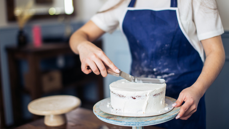 For super smooth frosting, use a bench scraper. Once you've applied the frosting, hold the bench scraper vertically against the edge of the cake to smooth any rough or lumpy spots.